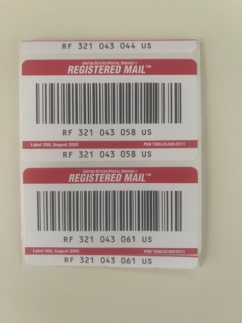 • Registered mail labels (USPS label #200). These are the red, black and white labels with the bar code on them and the registered mail # at the bottom.
