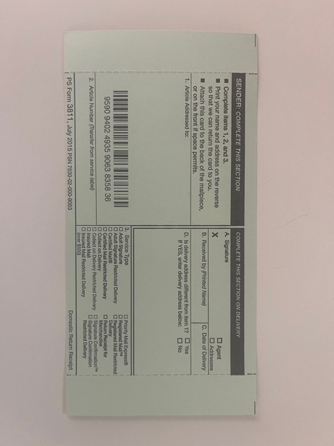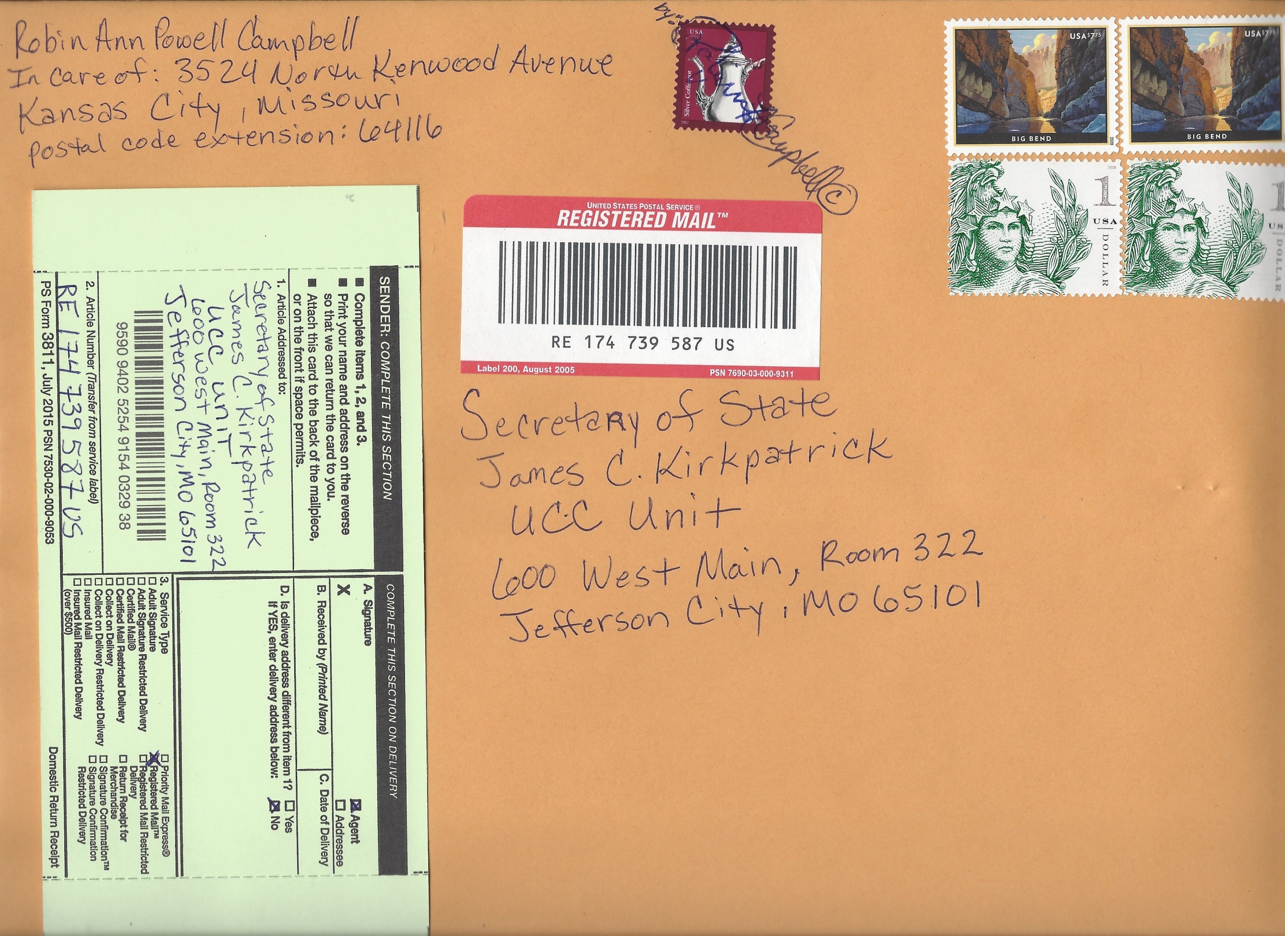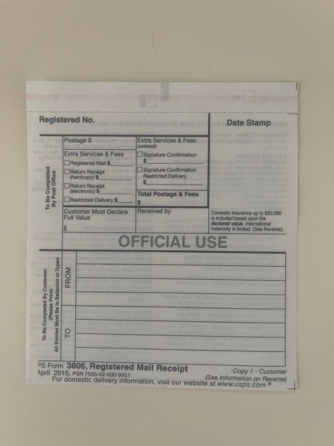 All of your notices and other documents that you send to the de-facto government should be sent priority mail with signature confirmation using metered mail instead of stamps. This will be easier to deal with at the post office since the postal workers are experienced with that method more than registered mail. Additionally, the delivery notification is recorded and easily downloaded from the USPS website or even emailed or texted to you upon delivery.
